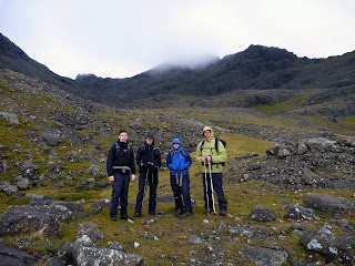 Our way out was to descend into Fionn Choire (photo four) and having crossed the Allt Dearg Mor about a kilometre below the Bealach a' Mhaim follow the footpath back to Sligachan. During this walk out we had sunshine and showers and a lovely rainbow before all enjoying a beer in the "Slig". It had been a successful start to our Cuillin Ridge Traverse Trip with better weather than we though we would get and for Martin - his first ever climb & abseil.
